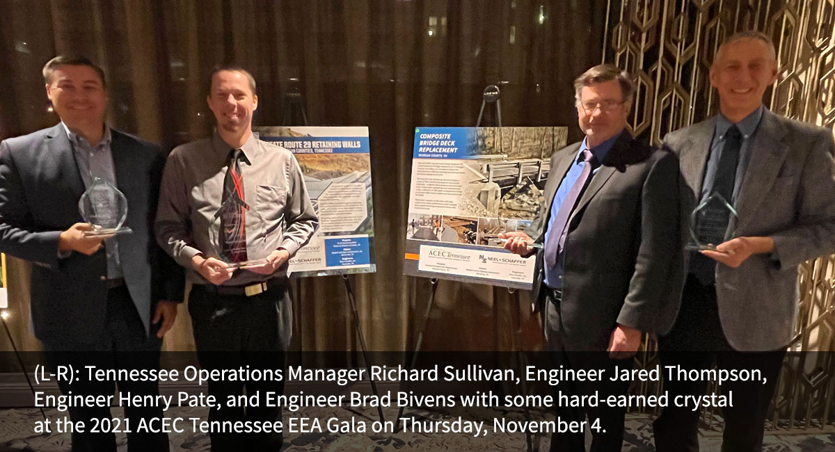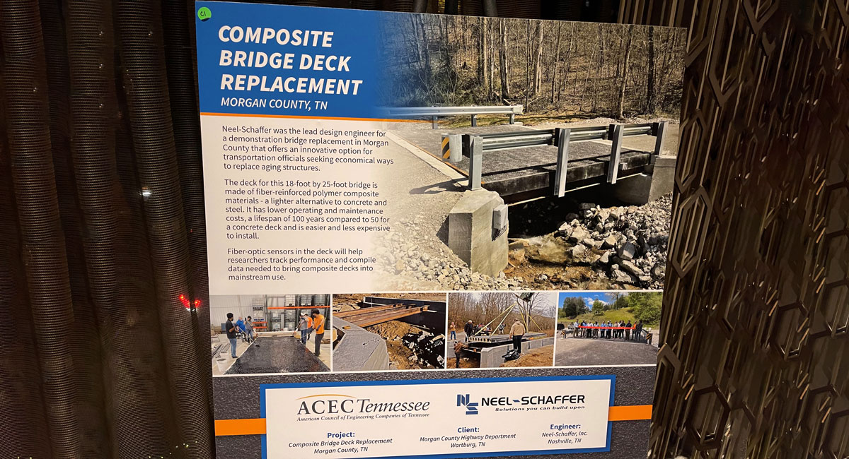 NASHVILLE, Tenn. (November 5, 2021) – Neel-Schaffer was the Lead Design Engineer for an innovative bridge replacement project in rural Morgan County (TN) that was chosen as the Grand Award Winner (Small Projects) in the “Structural Systems” category of the ACEC Tennessee Engineering Excellence Awards (EEA) contest.
