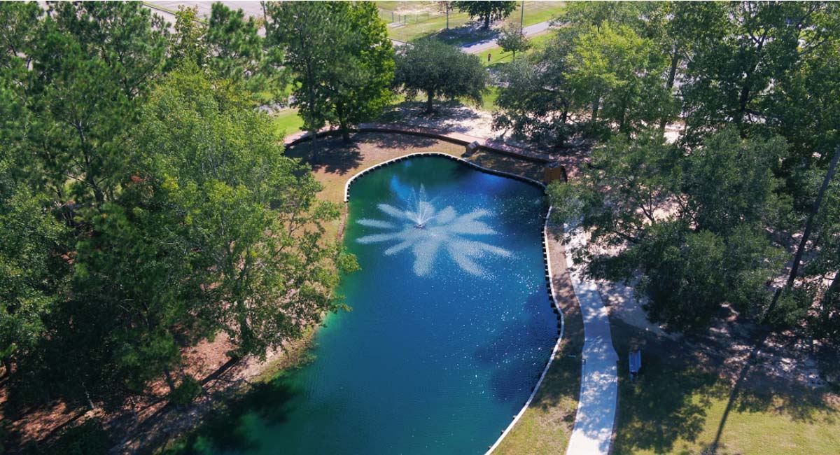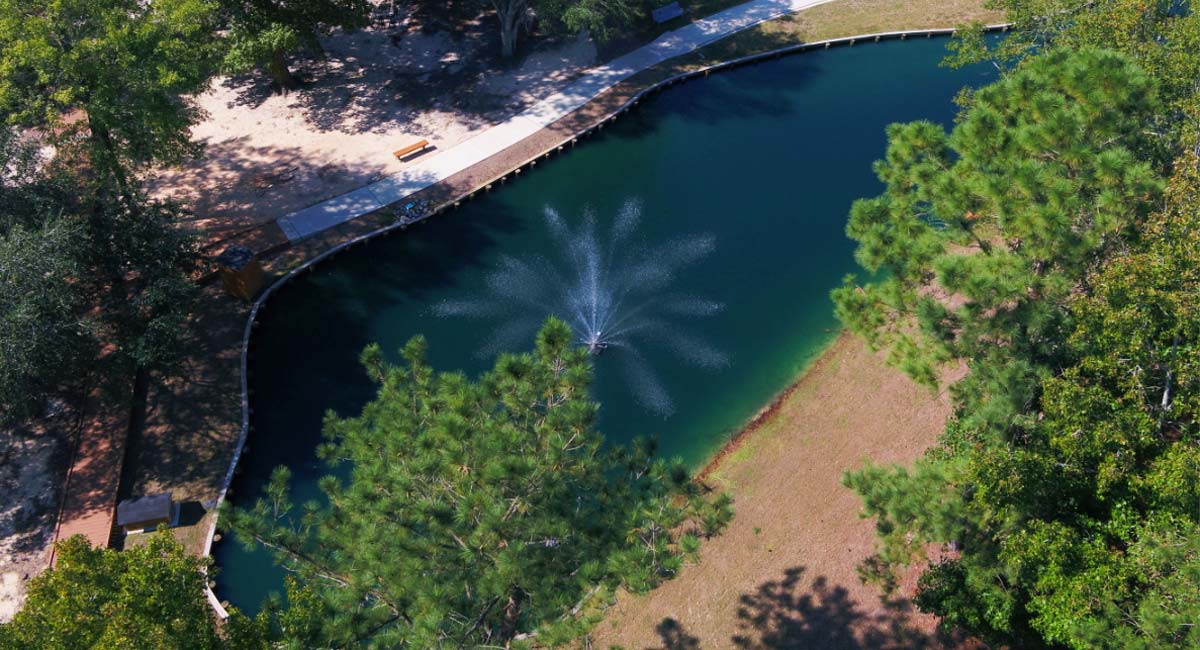 The walkway is routed through an oak grove, elevated to prevent damage to tree roots. The pond includes timber bulkheads and fountains as well as spillways for discharging storm event overflows.