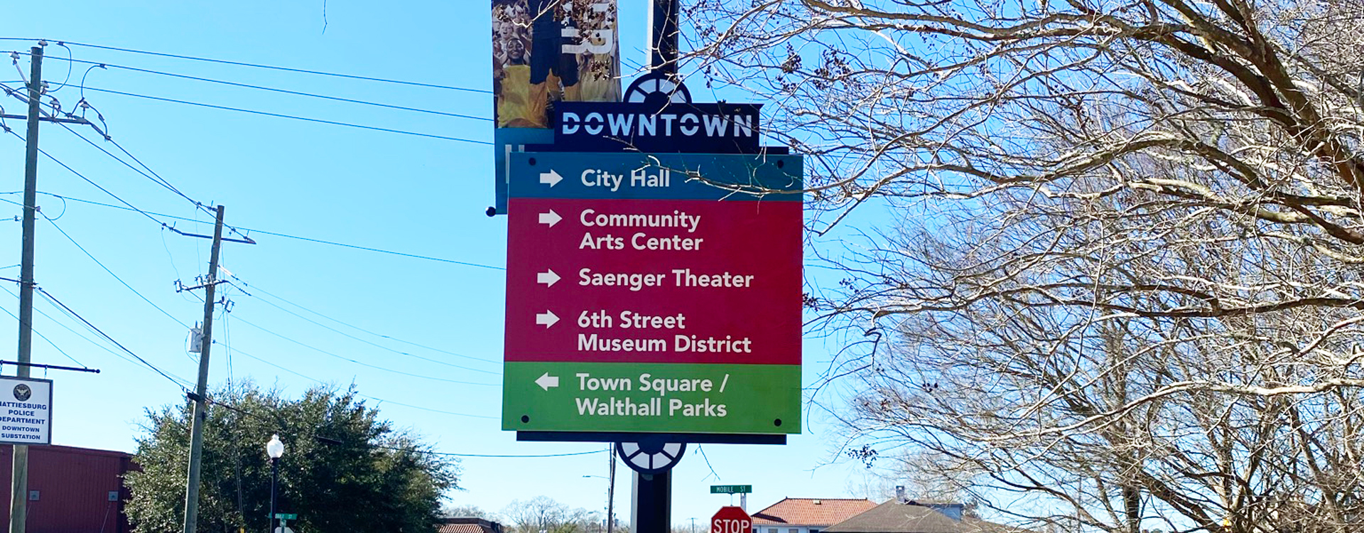 Neel-Schaffer provided engineering and landscape architecture design services for a project to construct vehicular wayfinding signs that are part of a dynamic, comprehensive improvement plan for downtown Hattiesburg, MS. Also included in the project were nine decorative parking signs, which designate public parking areas around downtown Hattiesburg.