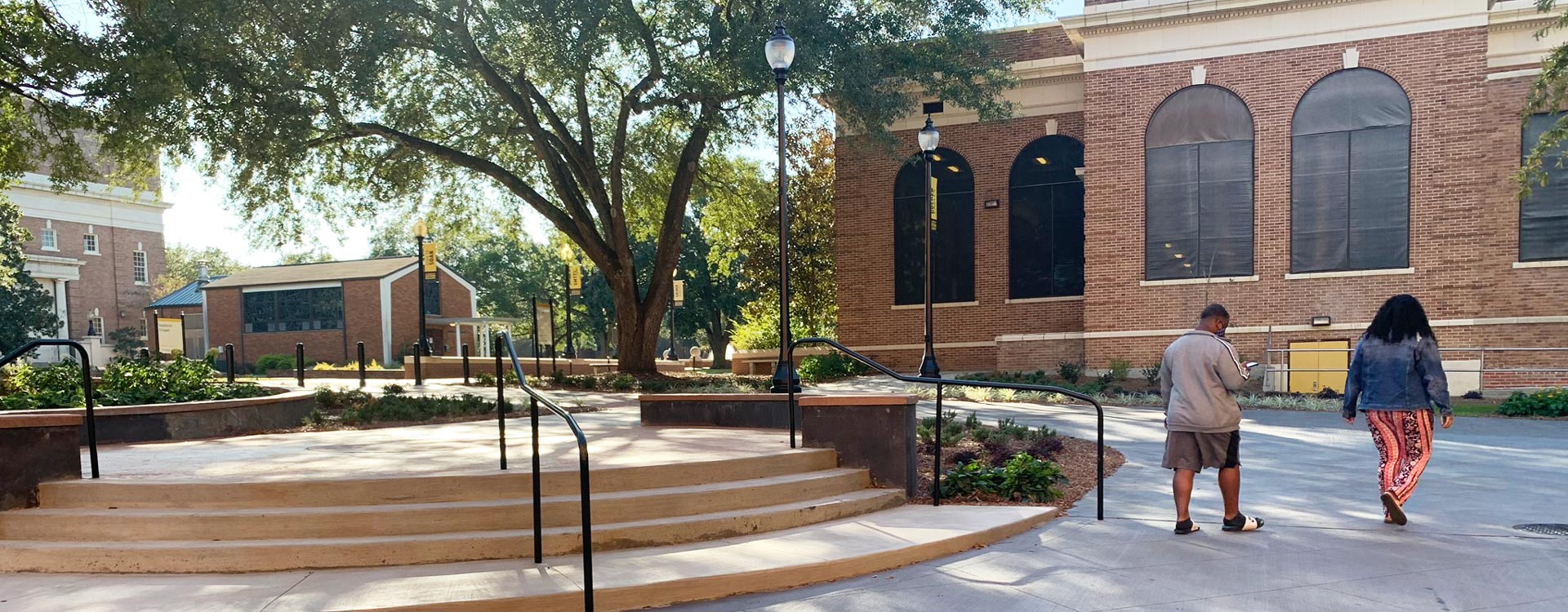 union that includes seat walls, a brick retaining wall with text from USM’s Alma