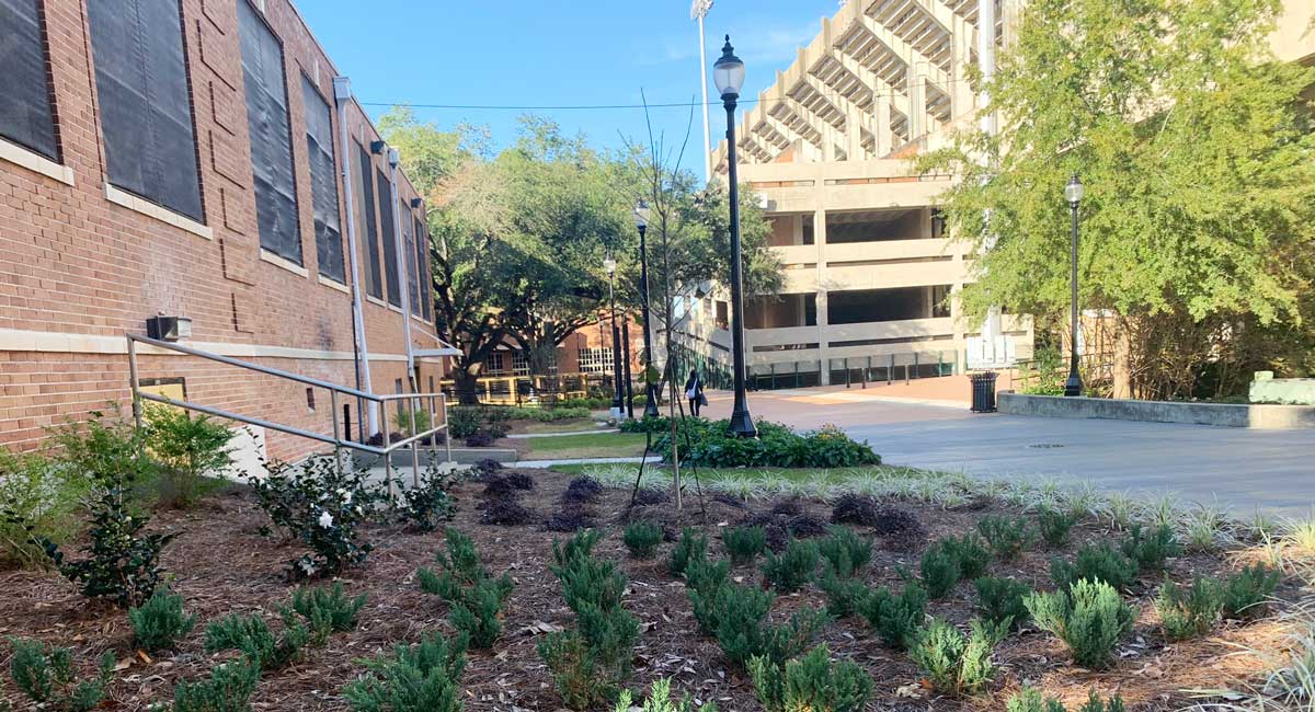 concrete, new landscaped beds with a variety of shrub/tree/groundcovers, two