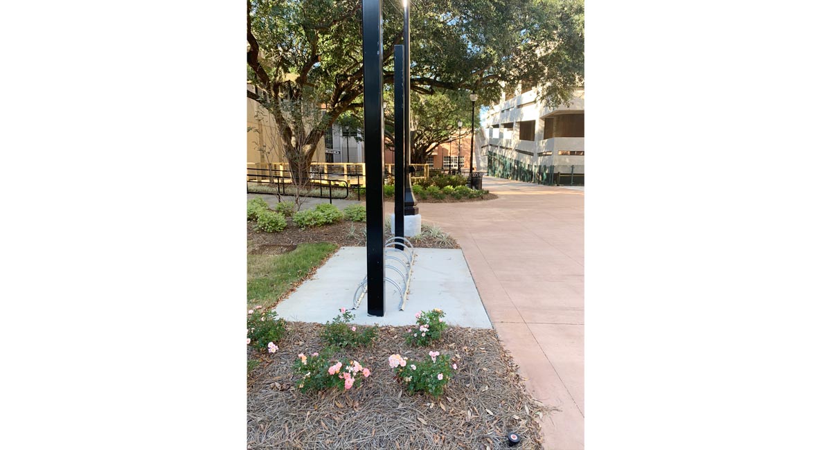 accessibility, a bike canopy with the USM logo, and a paver art logo at ground level
