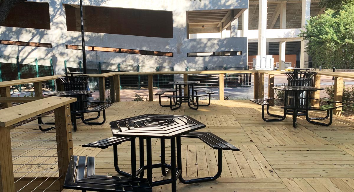 wooden decks overlooking the site, a plaza area at the entrance to the student
