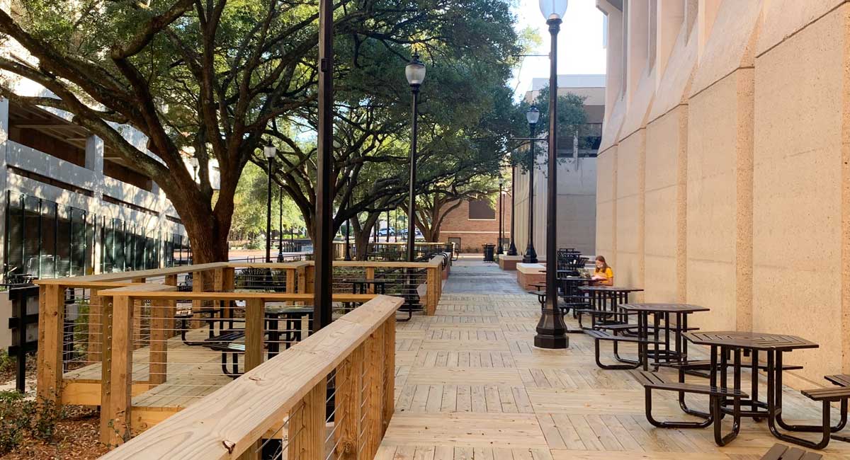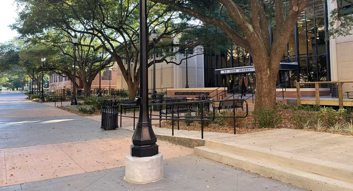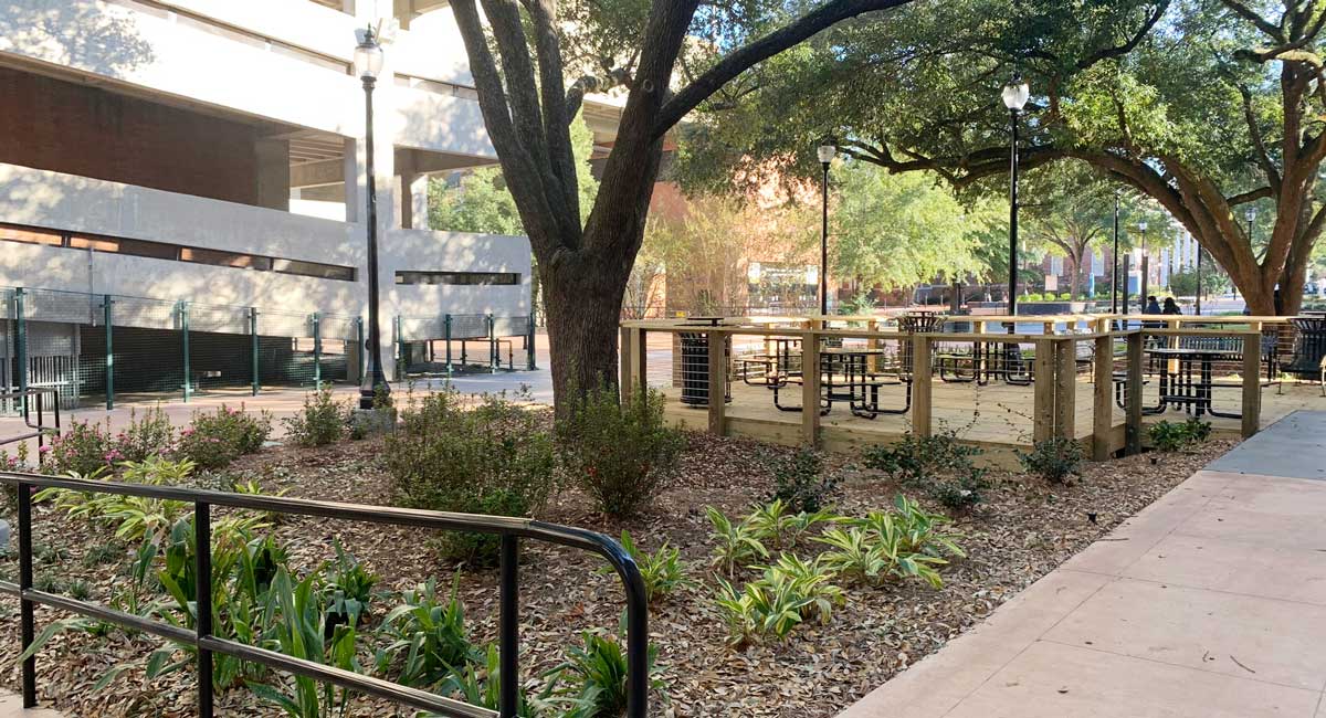 concrete surrounding five majestic oak trees. The pedestrian area is used daily