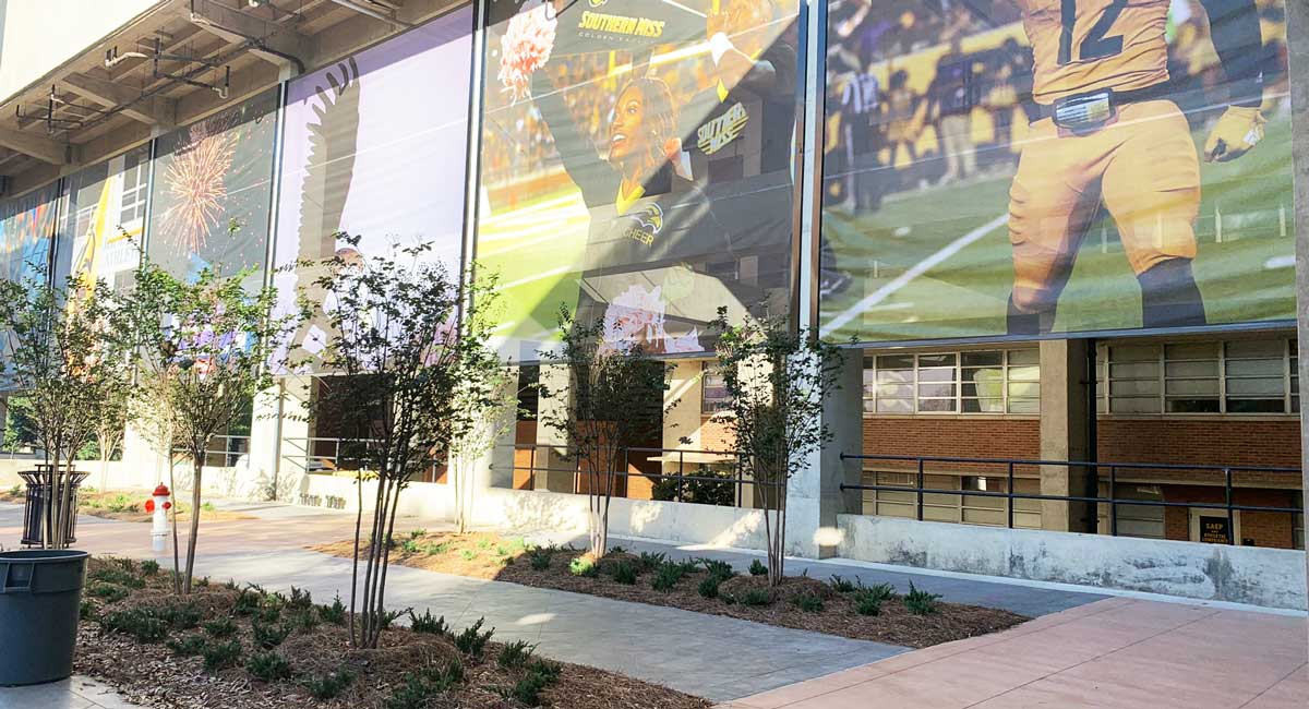 wall and 25-foot by 25-foot athletic banners that hang on the side of the football