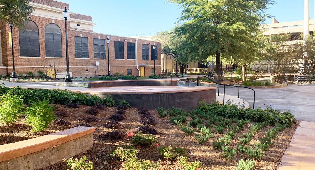 The project included removable bollards, new irrigation and lighting, a retaining