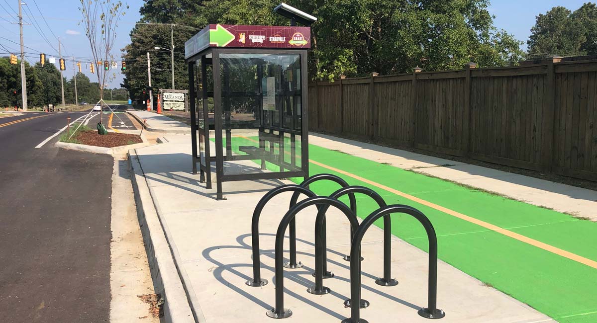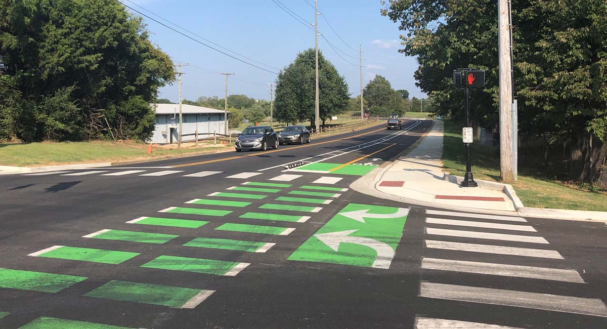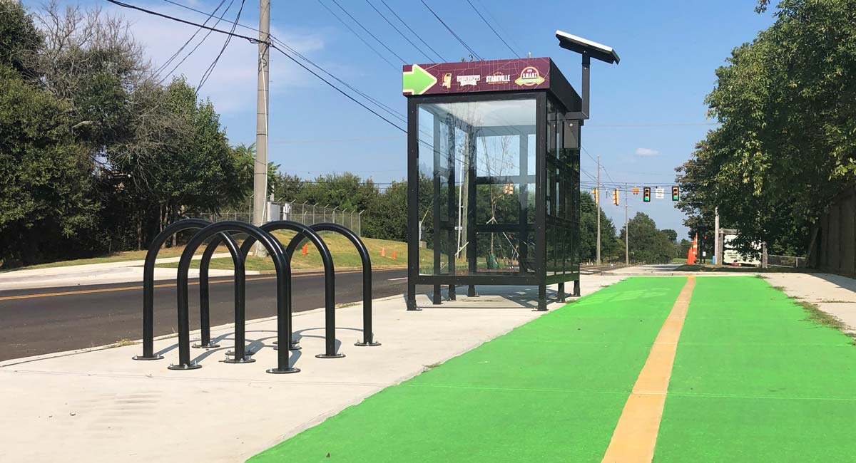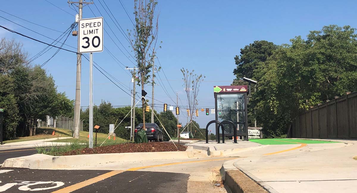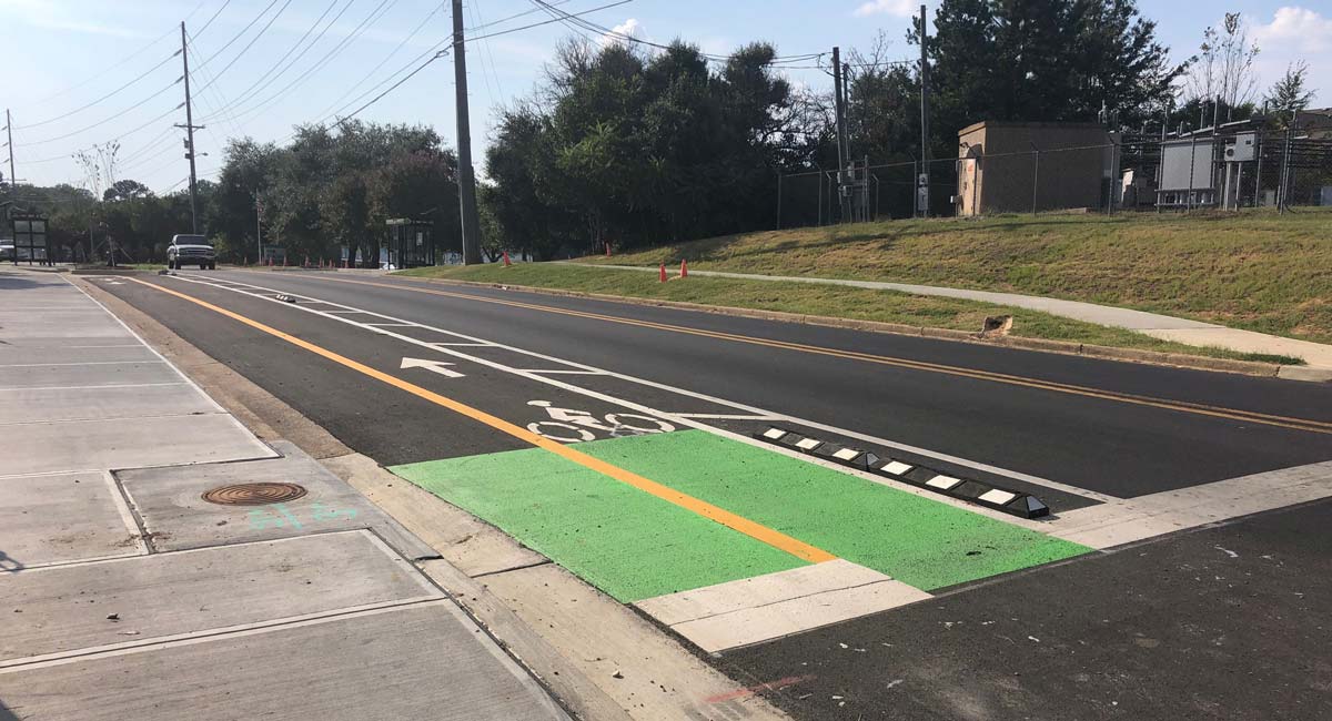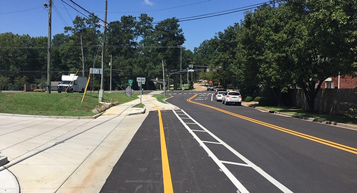Among the amenities is a two-way protected cycle track along Locksley way, a feature Neel-Schaffer engineers say is a first-of-its kind for the state of Mississippi. The protected bike lane is 8 feet wide and built into the road, adjacent to a 6-foot sidewalk. Other features include a two-stage left-turn box for cyclists to use at intersections, and a “floating bus stop,” where the cycle track merges into one level with the sidewalk and bus stop to form a multi-modal facility.