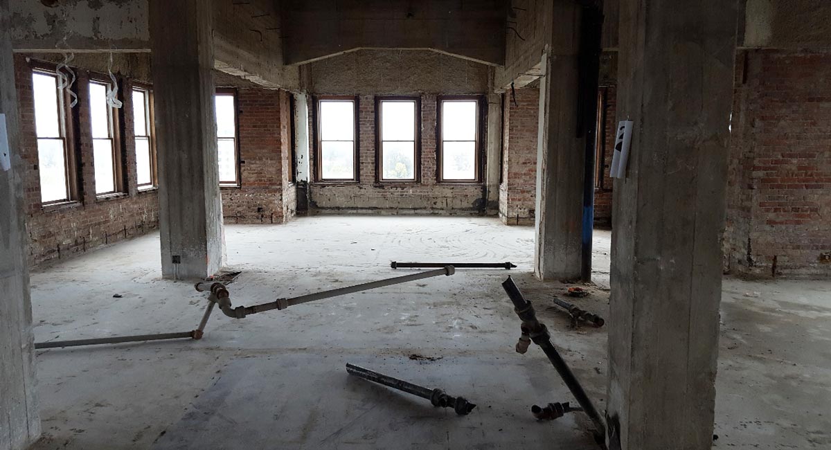 When completed, the re-purposed building will be home to renovated office and retail space, a restaurant, and apartments.
