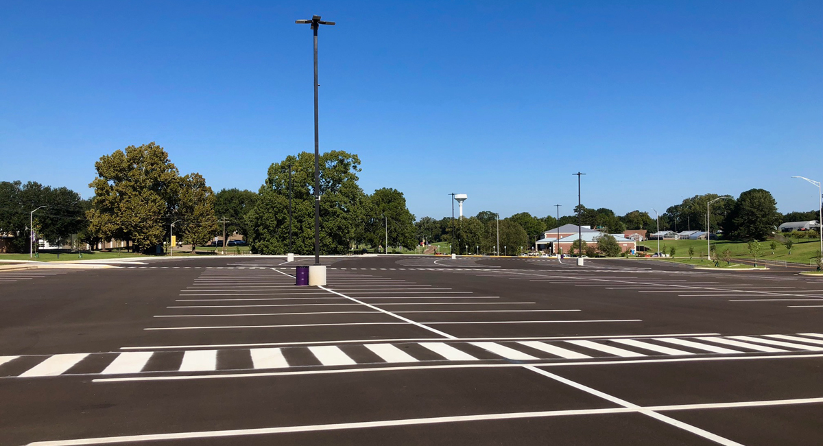 The new parking lot has approximately 1,530 LF of access road arranged in a boulevard style with raised medians. This new access provides for safe and efficient entrance and exit to the parking facilities on game day, with a north-and south-bound entrance lane and one exit lane. The design includes lighting and landscaping at the entrance to the campus and throughout the parking lot, intersection improvements, and 500 pervious concrete parking stalls, including several handicapped spaces.