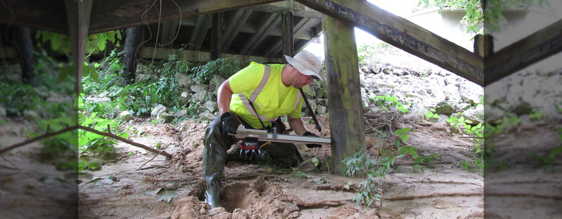 Inspections are conducted during a 10-month period each year, by two-and three-member crews. All inspections are performed in accordance with the specifications set forth in the National Bridge Inspection Standards and the AASHTO Manual for Bridge Evaluation. Inspections were done on foot, except where ladders and/or boats were used to bring the inspectors within “arms length” of the bridges. Soundings are taken at each bent and other locations, allowing for adequate depiction of the stream bottom along the upstream edge of each bridge, using the deck as a reference point.