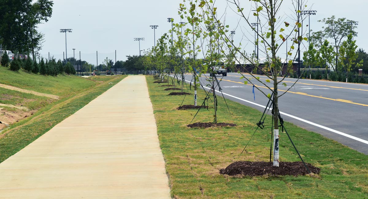 While the preliminary design included four lanes, construction plans were developed for a two-lane, open-ditch roadway, with a 10-foot multi-use path. The project included widening to three lanes, with the potential to go to five lanes, at the approaches to the Blackjack Road intersection. The project included design and construction administration for the rehabilitation of Blackjack Road between Locksley Way and the traffic circle at Oktoc Road.