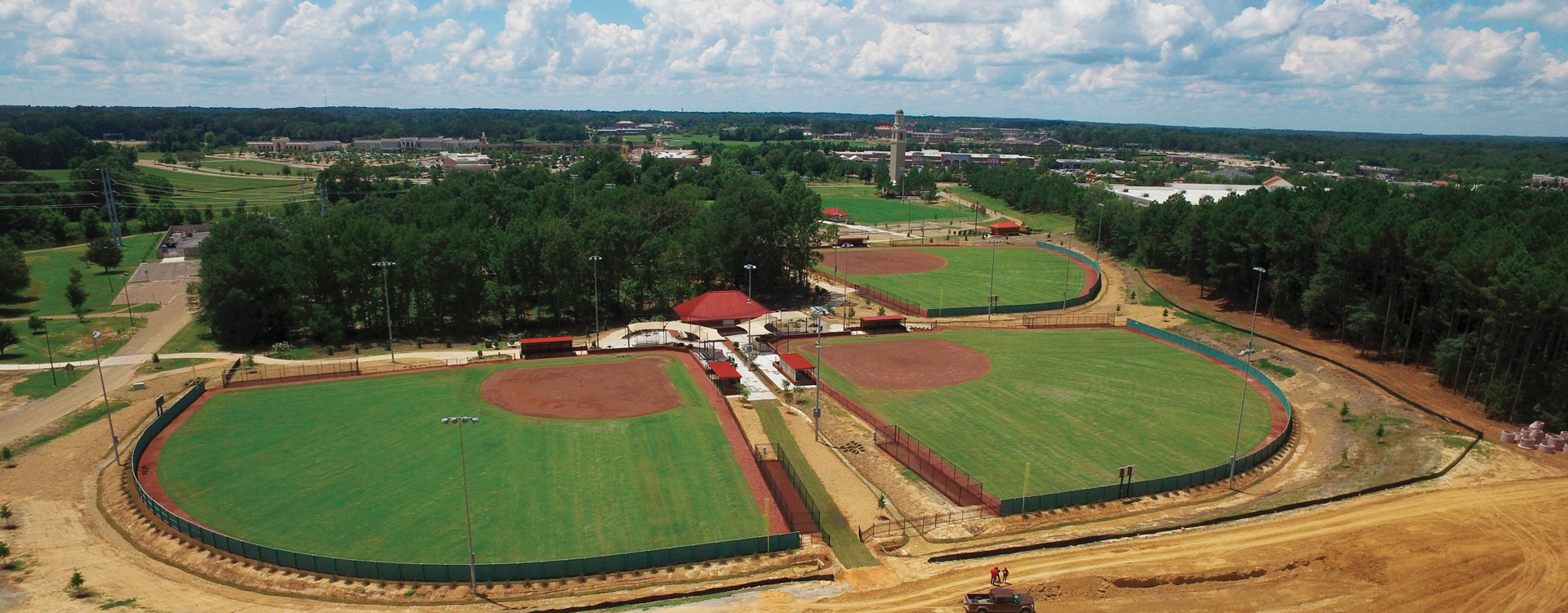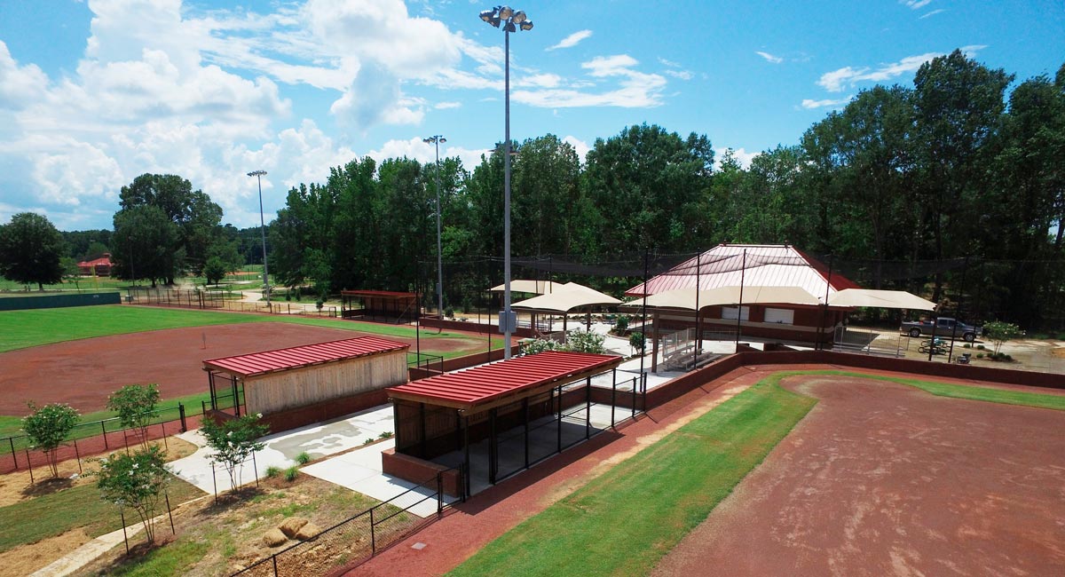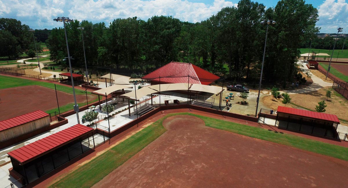The new fields have high-quality natural turf outfields, skinned infields, brick backstop walls, nostalgic wood outfield fences, expansive dugouts with protected areas for on-deck batters, irrigation, remotely controlled field lighting, and spectator bleachers that are covered by fabric shade structures.