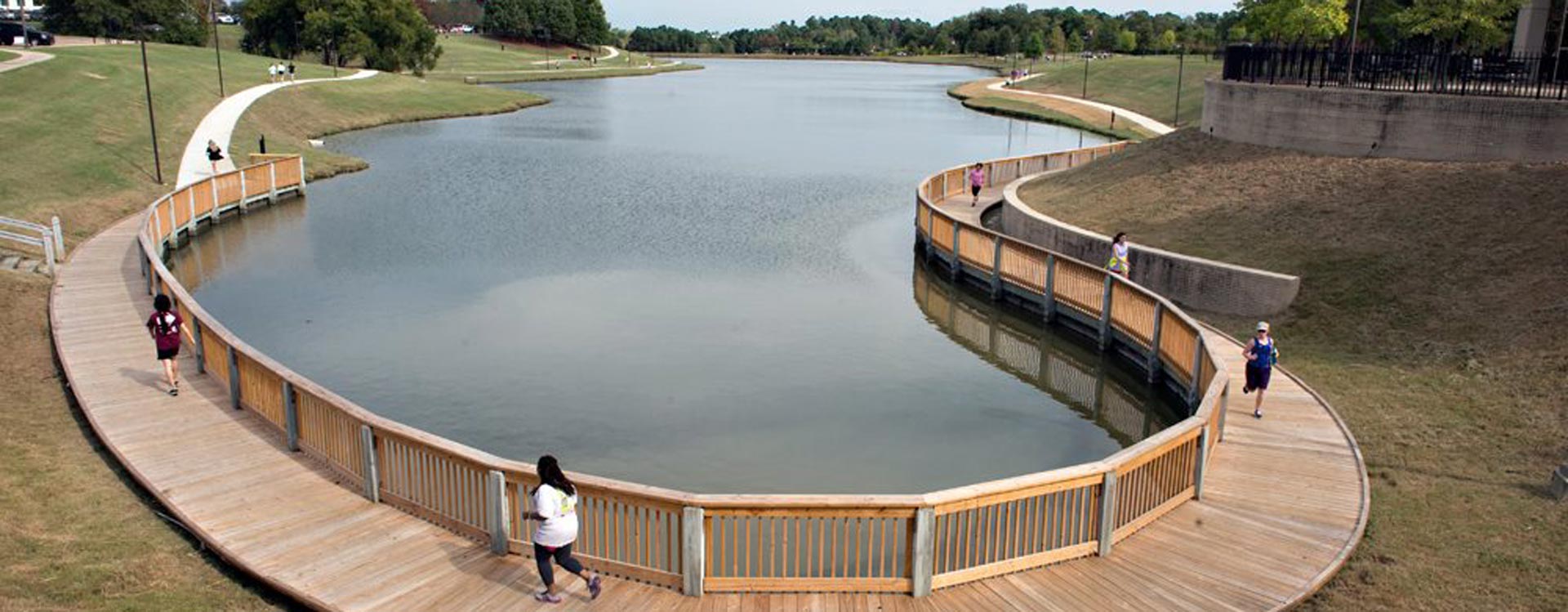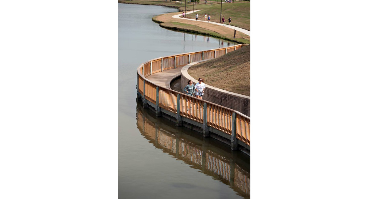 The one-mile, concrete loop connects to an existing boardwalk on the banks of the small campus lake. The six-foot wide trail is for pedestrian use only and connects to another existing path that parallels a main campus road. There are several other entrance points and elevated seating areas along the ADA-compliant path.