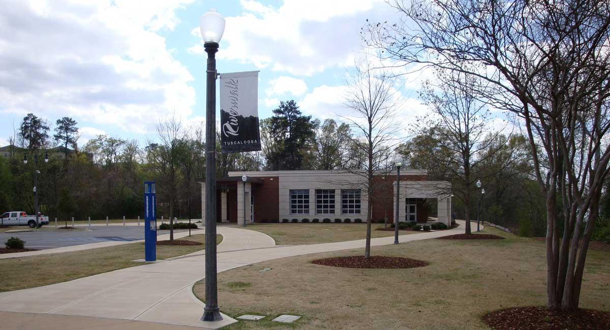 Situation on the banks of the Black Warrior River, the building is steel framed with masonry infill walls and exterior brick veneer.