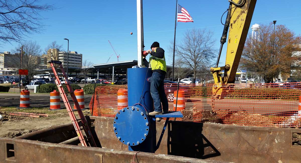 The repair design required an intermediate line stop to help isolate the repair area so that pressure could be relieved and the flow of water could be redirected through the distribution system. Numerous checks and safeguards were made and put in place to ascertain that adequate flow and pressure could be maintained to the redirected flow for critical water users such as the nearby University of Mississippi Medical Center.
