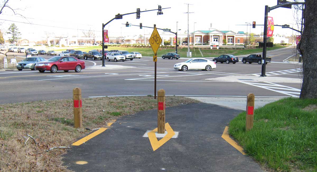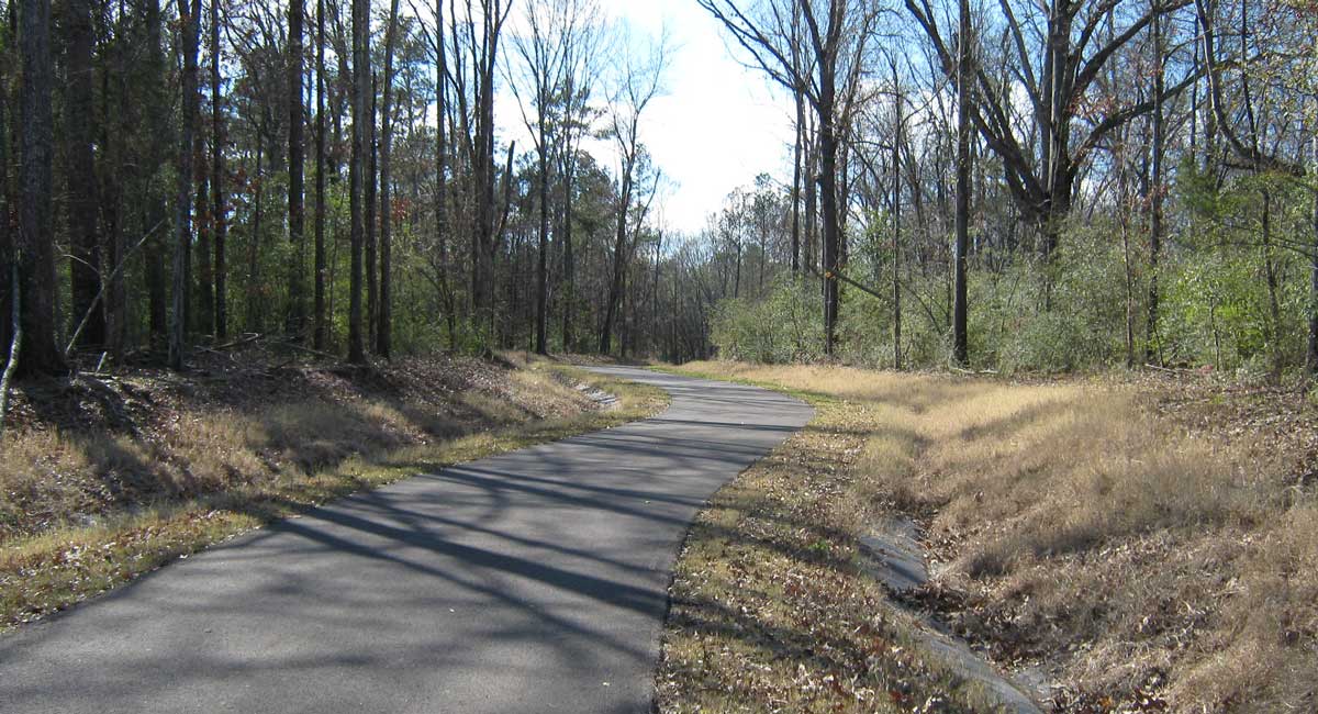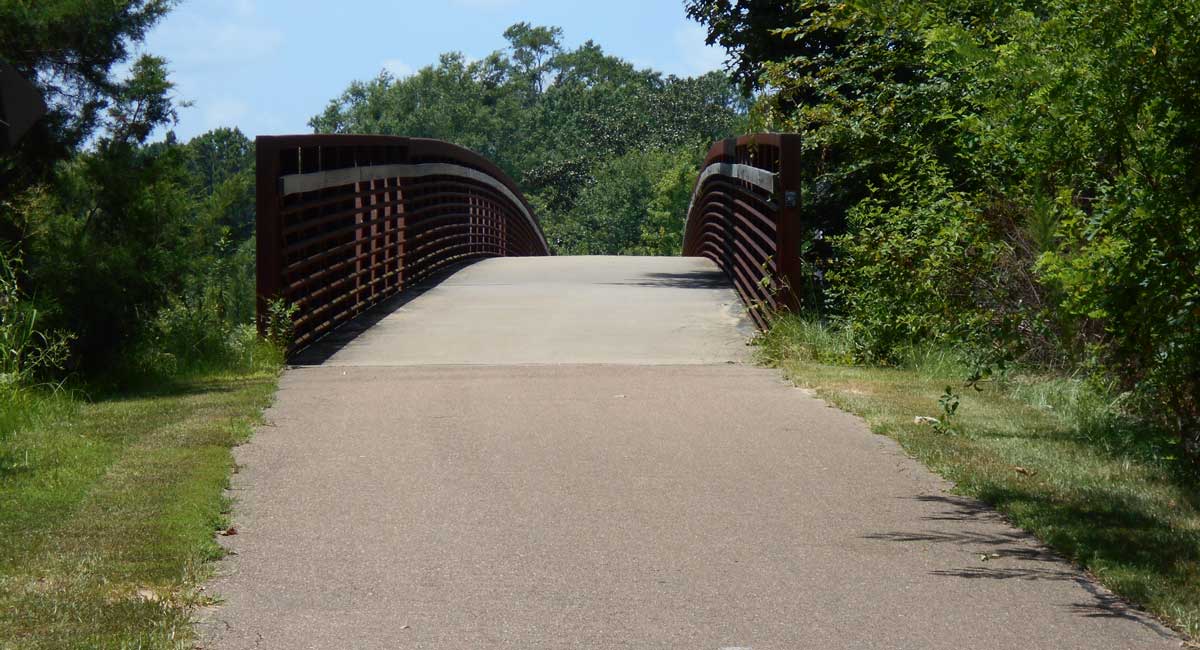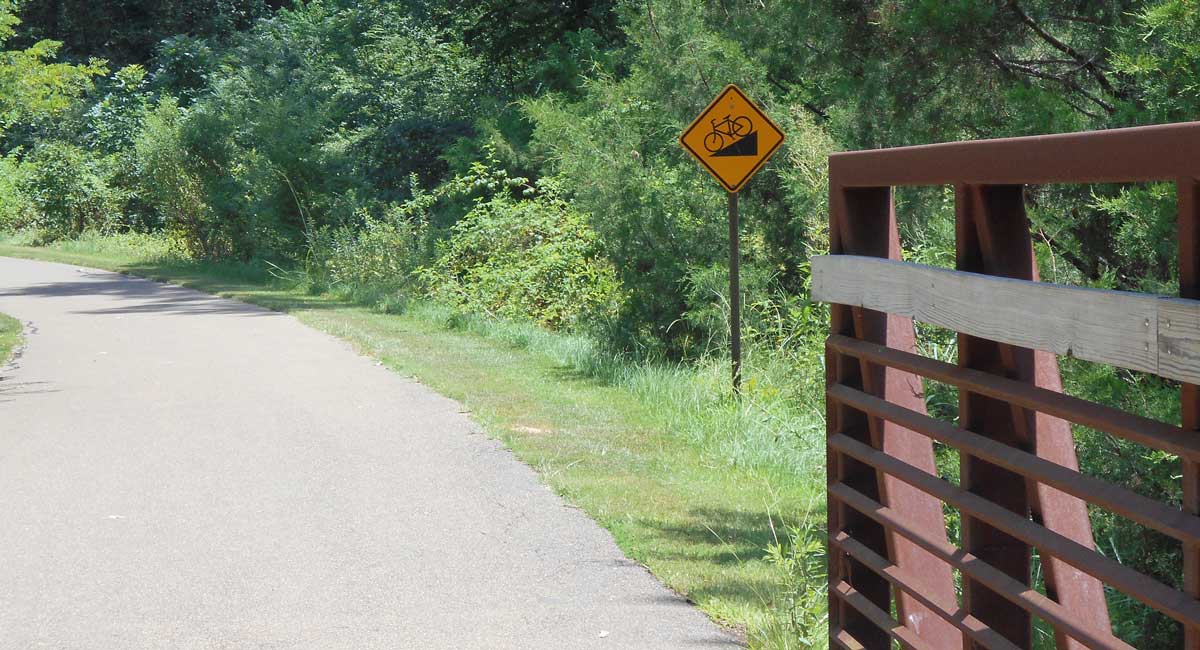 The majority of the path traverses the wooded right-of-way of the Natchez Trace Parkway and will connect with trails the National Park Service plans to construct. This section of the path features natural settings and a 250-foot arched steel pedestrian bridge spanning the main rail line of the Canadian National/Illinois Central Railroad. It also crosses Interstate-55 by means of a dedicated bicycle lane that the National Park Service incorporated into the design of the new bridge it completed.