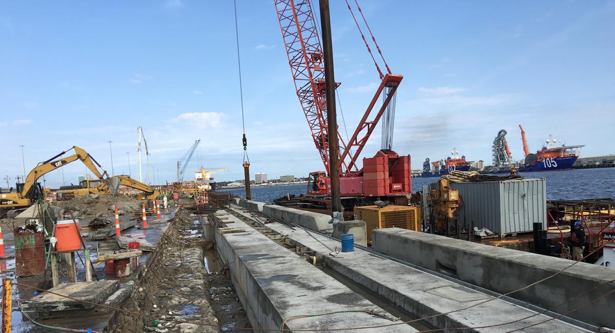 As the design lead firm, Neel-Schaffer provided a variety of engineering services in support of the masterplan implementation. Services included civil, utilities, geotechnical, water, wastewater, structural, road, rail and environmental. Neel-Schaffer sister firm Maptech worked on the project, too. Among the projects Neel-Schaffer managed was a $118 million, 84-acre expansion of the west side of the west pier, with a new warehouse, administrative buildings, roads, and an intermodal rail yard, and a $60 million upgrade of the west pier wharf, needed to support three new $36 million, 360-foot tall Post-Panamax ship to shore rail mounted gantry cranes that were installed in 2016.