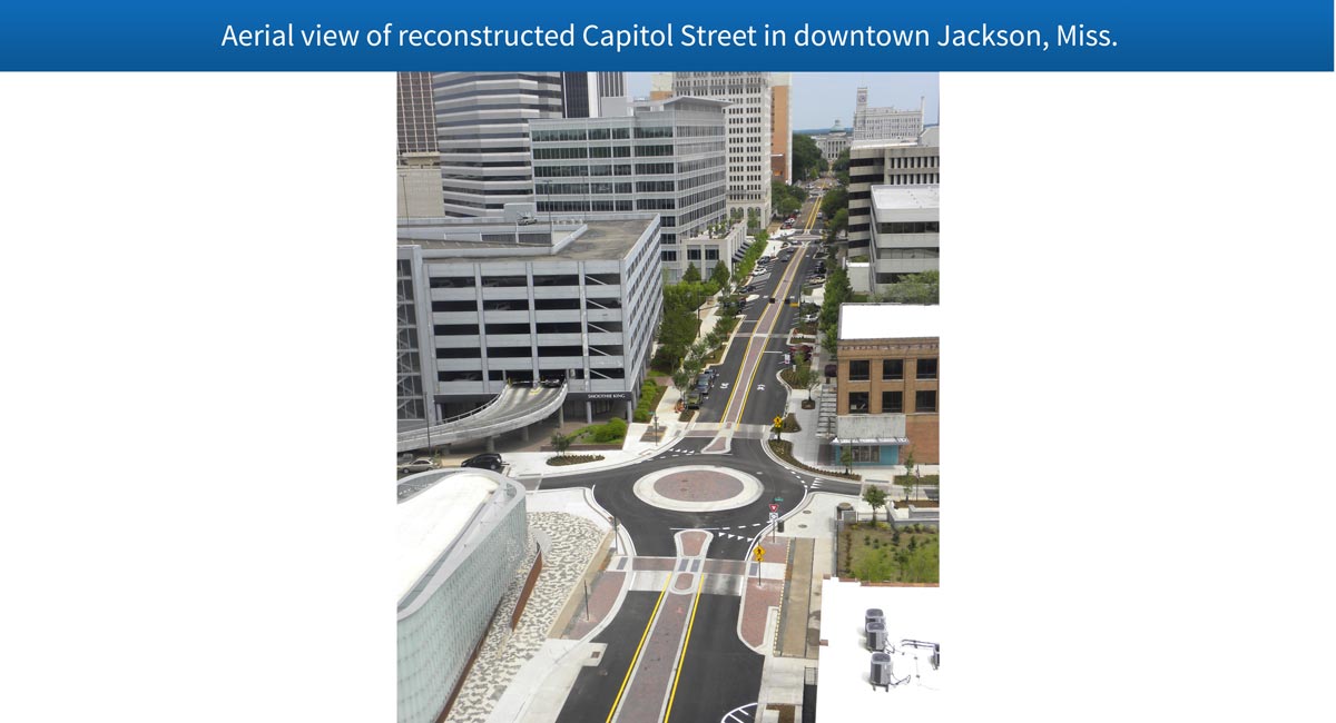 The City is now trying to reverse that trend, starting with this massive makeover of the Capitol Street corridor. Neel-Schaffer managed a program that included funding, design, and construction engineering services for the $6.2 million Phase 1 project that transformed Capitol Street to a two-lane, two-way street that includes three new roundabouts, improved, widened and ADA-compliant sidewalks, new landscaping, and other traffic-calming features that City officials hope make the corridor more receptive for pedestrians, bicycles, businesses, and residents.