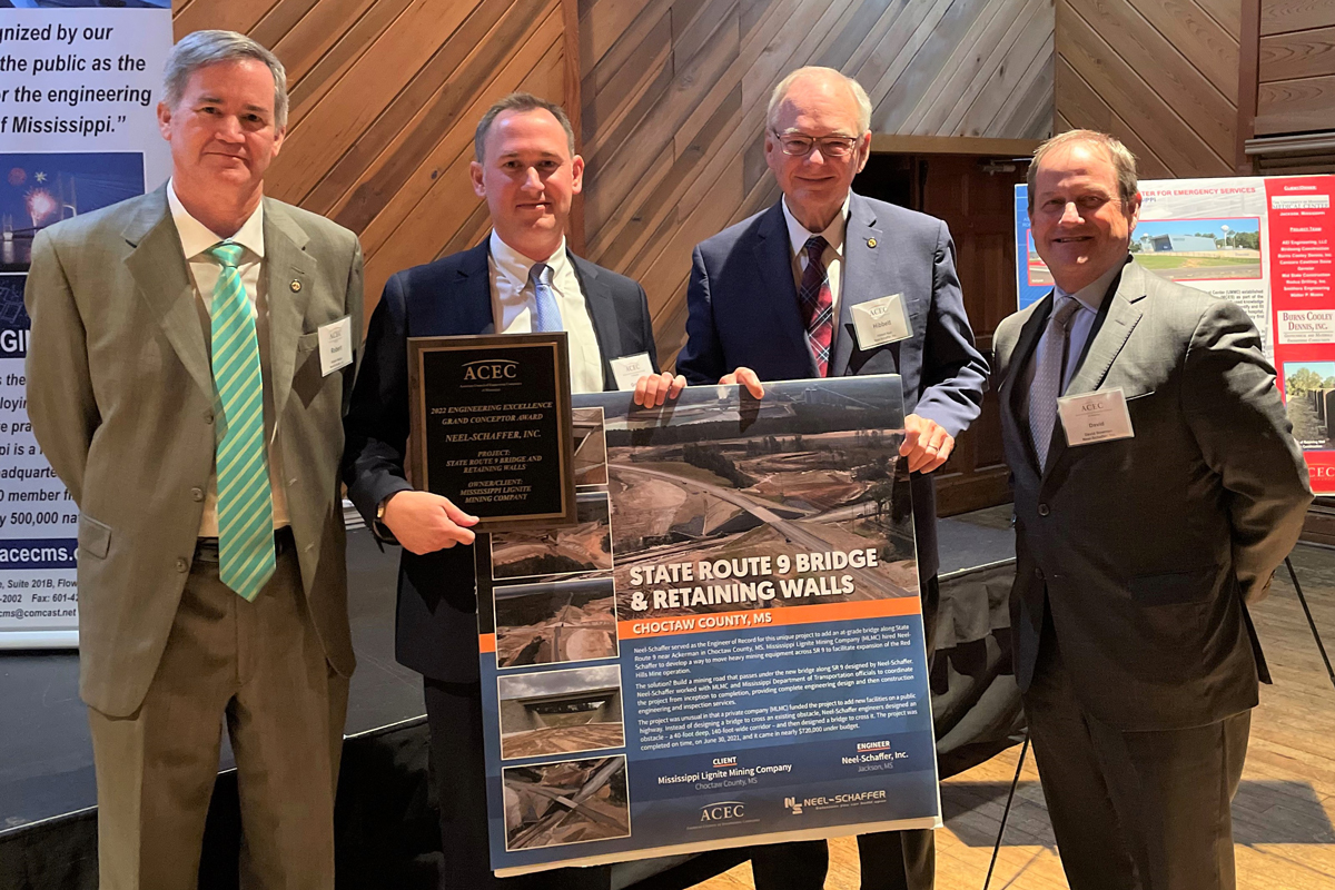 JACKSON, Miss. (March 11, 2022) – Neel-Schaffer is pleased to announce that a bridge and retaining walls project it completed last year has received the 2022 Grand Conceptor Award from the Mississippi chapter of the American Council of Engineering Companies (ACEC/MS).