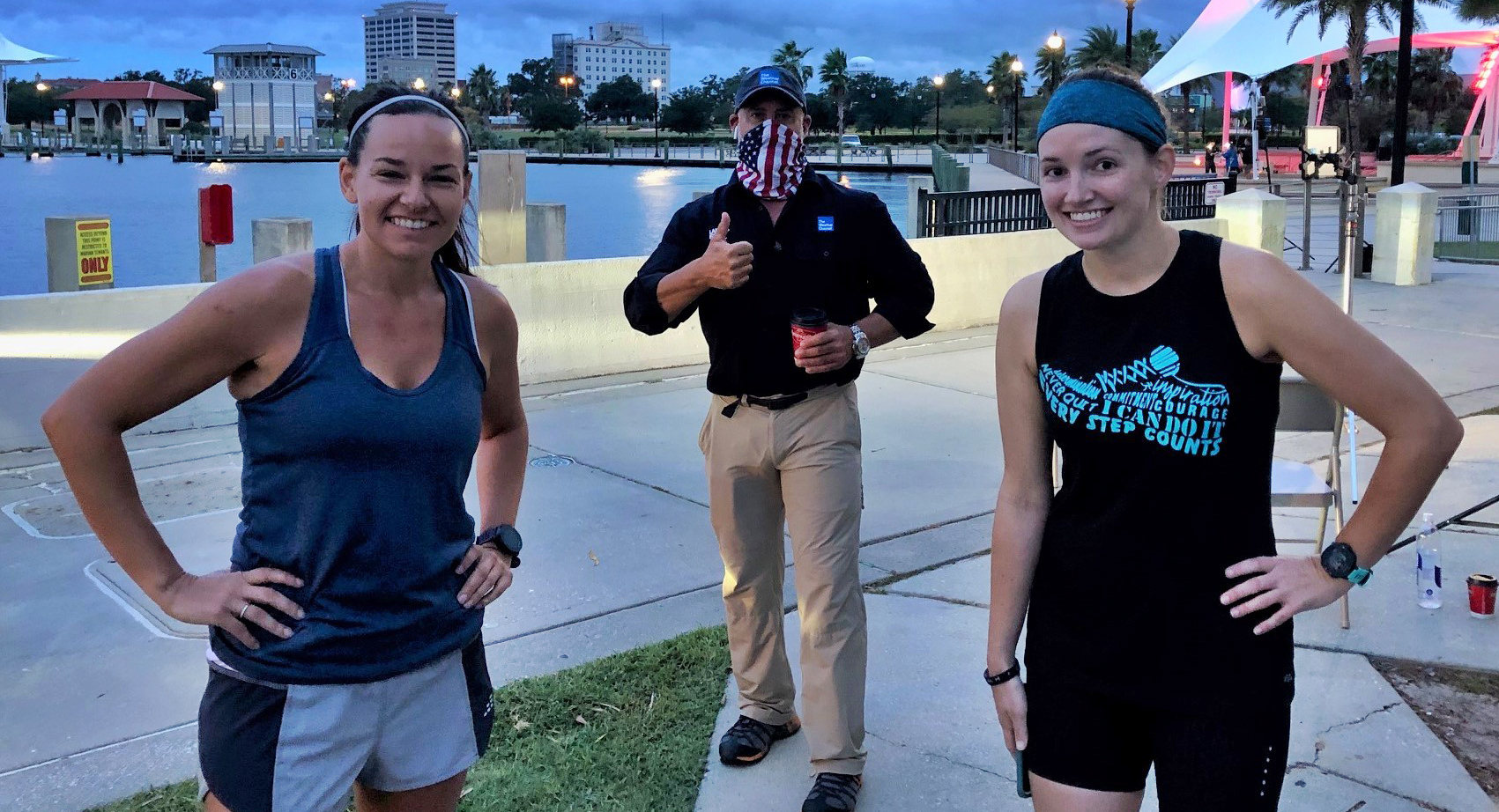 She even met a celebrity during one run, posing for early morning pictures in Gulfport with Jim Cantore of the Weather Channel, who was doing live shots in advance of Hurricane Sally. (That’s Kari on the left, with running partner Kelsey Deschamp on the right in the above photo).