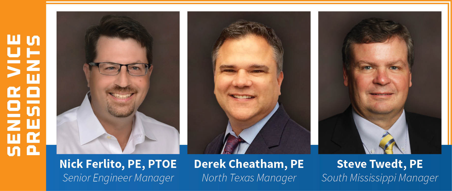 Derek Cheatham, PE, Nick Ferlito, PE, PTOE, and Steve Twedt, PE, are now Senior Vice Presidents with the firm.