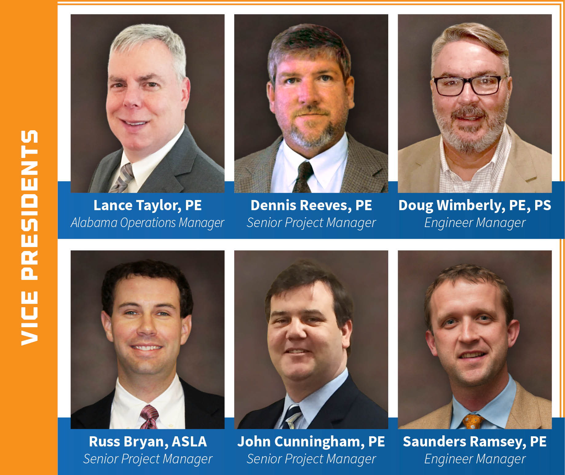 Russ Bryan, ASLA, John Cunningham, PE, Saunders Ramsey, PE, Dennis Reeves, PE, Lance Taylor, PE, and Doug Wimberly, PE, are now Vice Presidents with the firm.